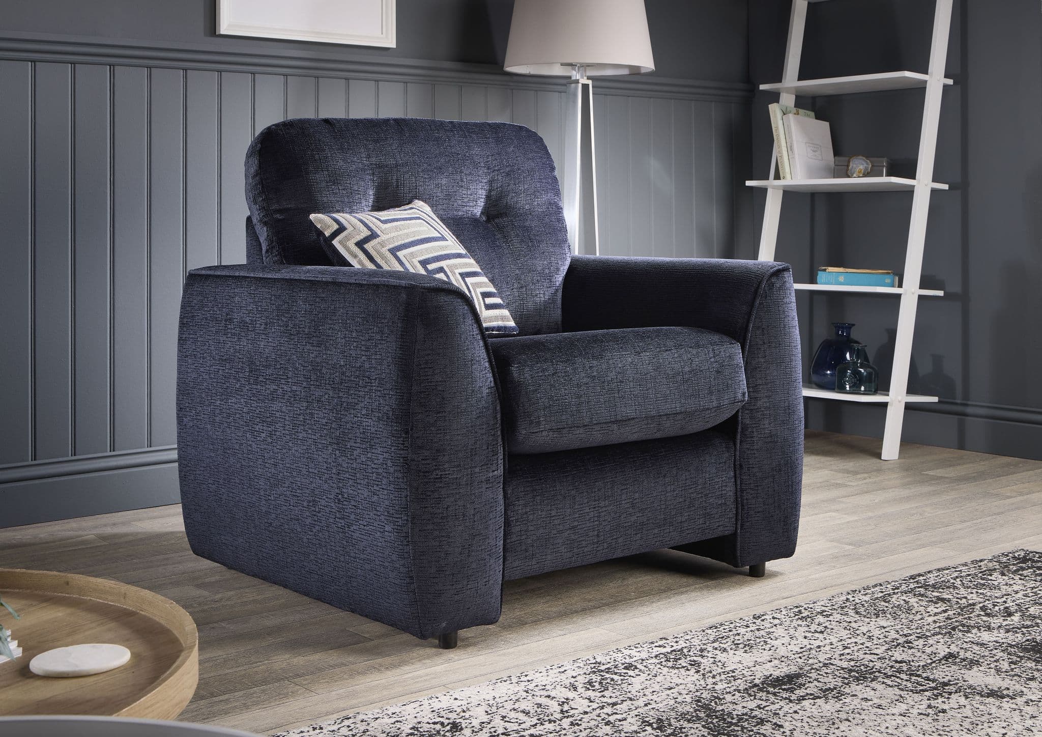 Upholstered in premium chenille fabric for a soft, textured finish